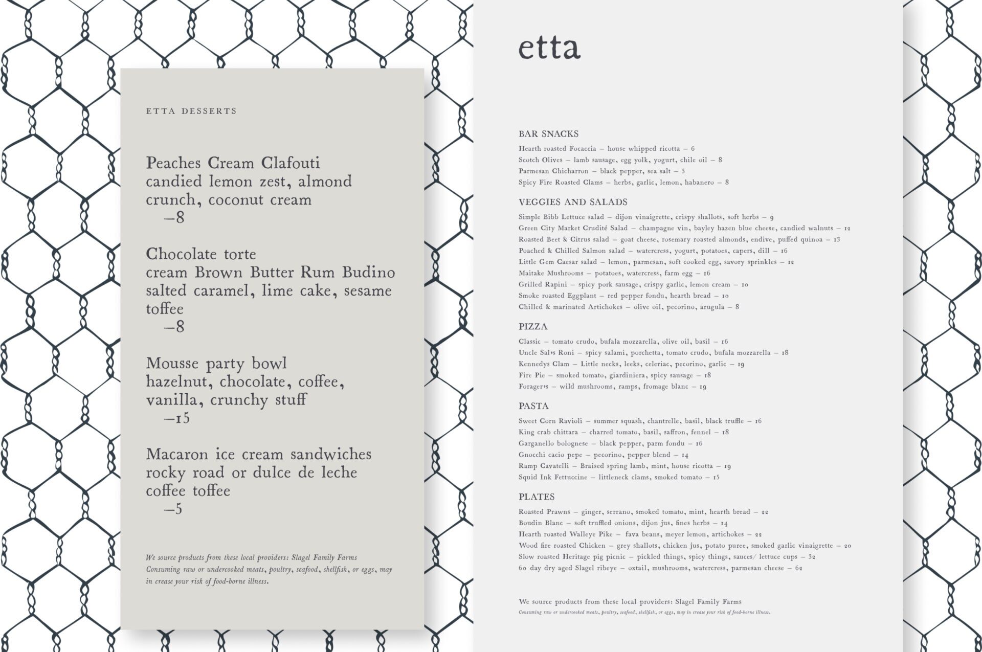 After experiencing the magic of the hearth firsthand, we crafted a brand identity that was as inviting as the food itself. We created a timeless yet approachable look using rustic serif typography and hand-drawn illustrations. Whether etched in tile, embroidered on staff uniforms, or die-cut from steel, Etta’s brand was designed to feel as welcoming and enduring as a well-loved hearth.
