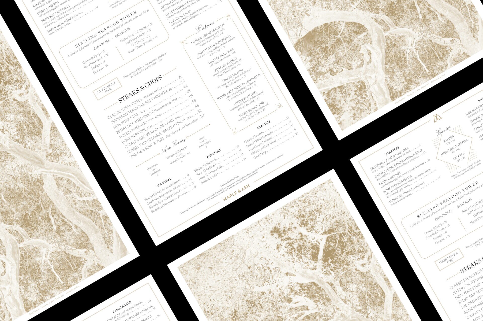 Collaborating closely with the Maple & Ash team, we developed a brand that balances sophistication with a hint of rebellion. The logo—a monogram reminiscent of cattle brands but designed with the sophistication of a finely tailored suit—blends classic steakhouse elements with a modern fashion. Every design element we create reflects the restaurant’s unexpected flair, from refined art-deco-inspired patterns to playful typographic combinations. We mirrored the irreverent tone in their menu, where dishes like the “I Don’t Give a F*@k” tasting menu break with tradition and invite diners to embrace indulgence and celebration.