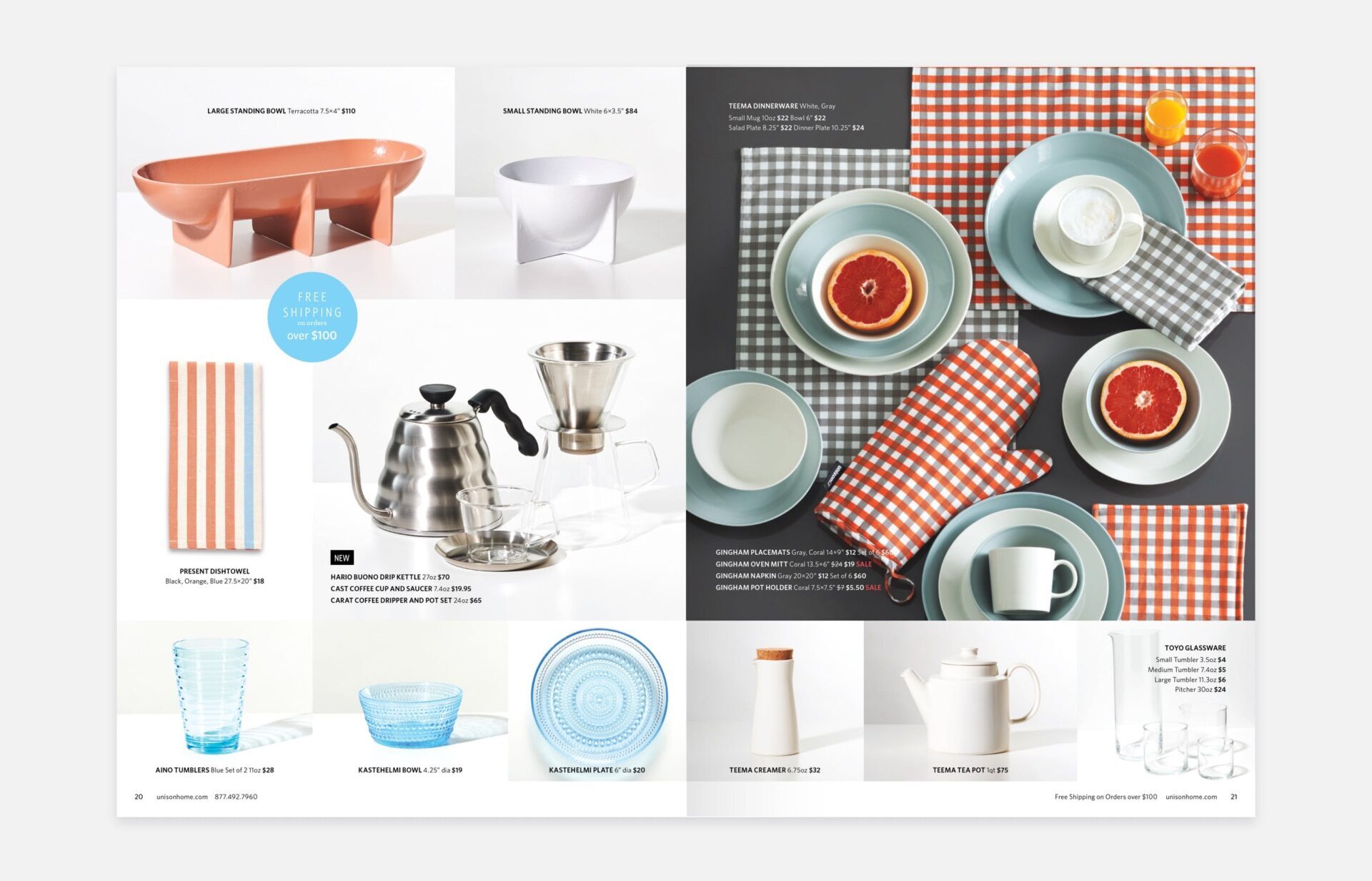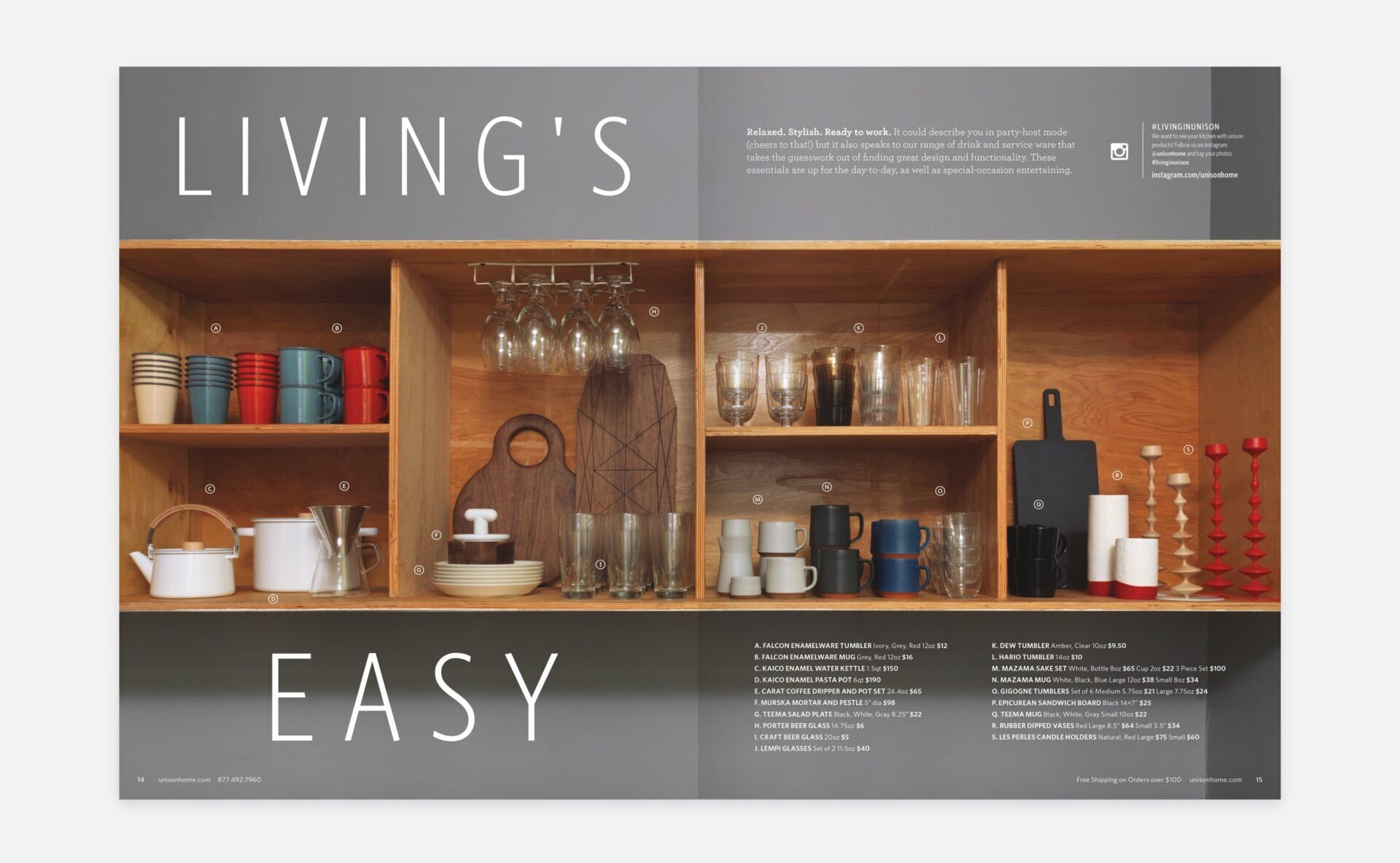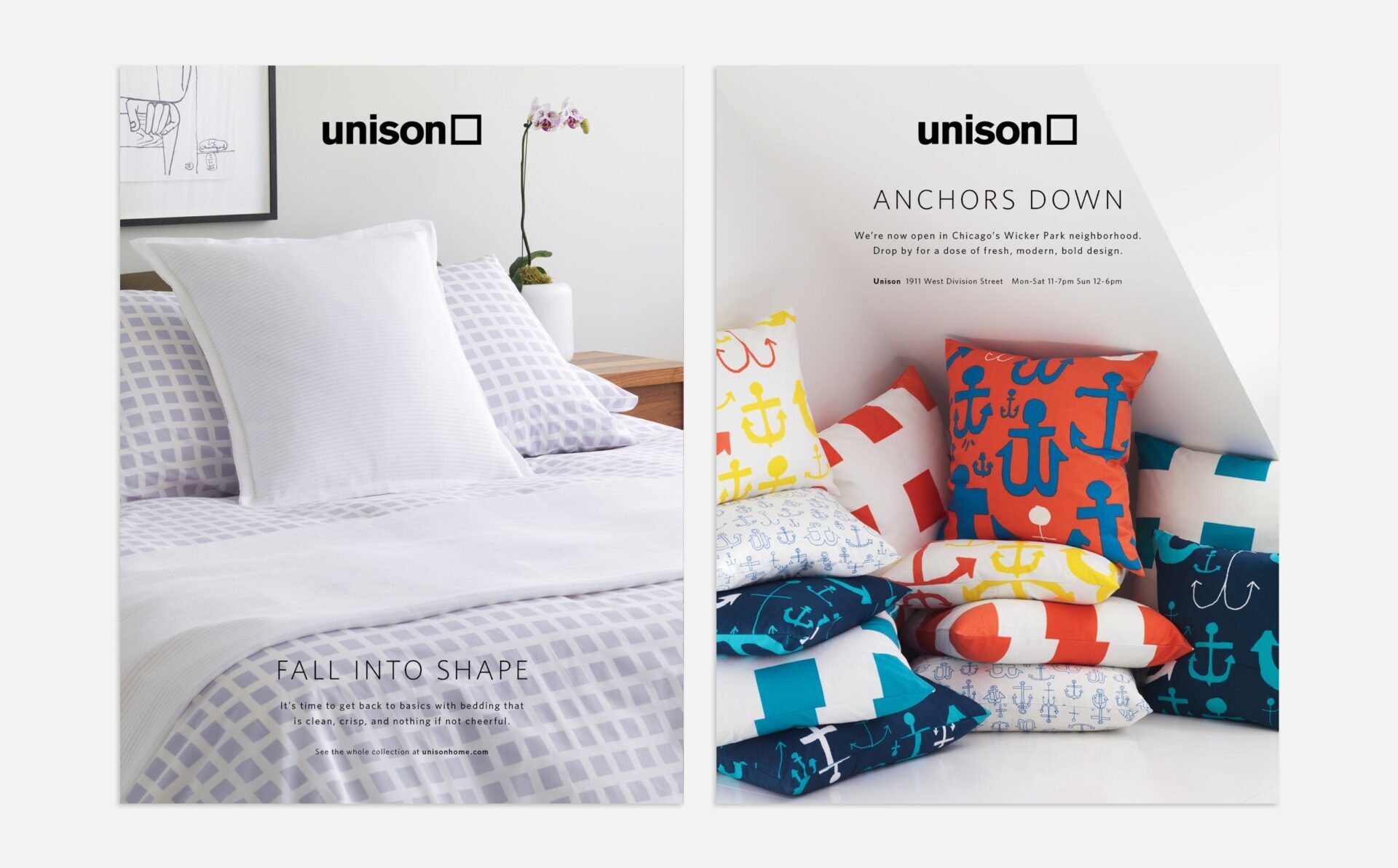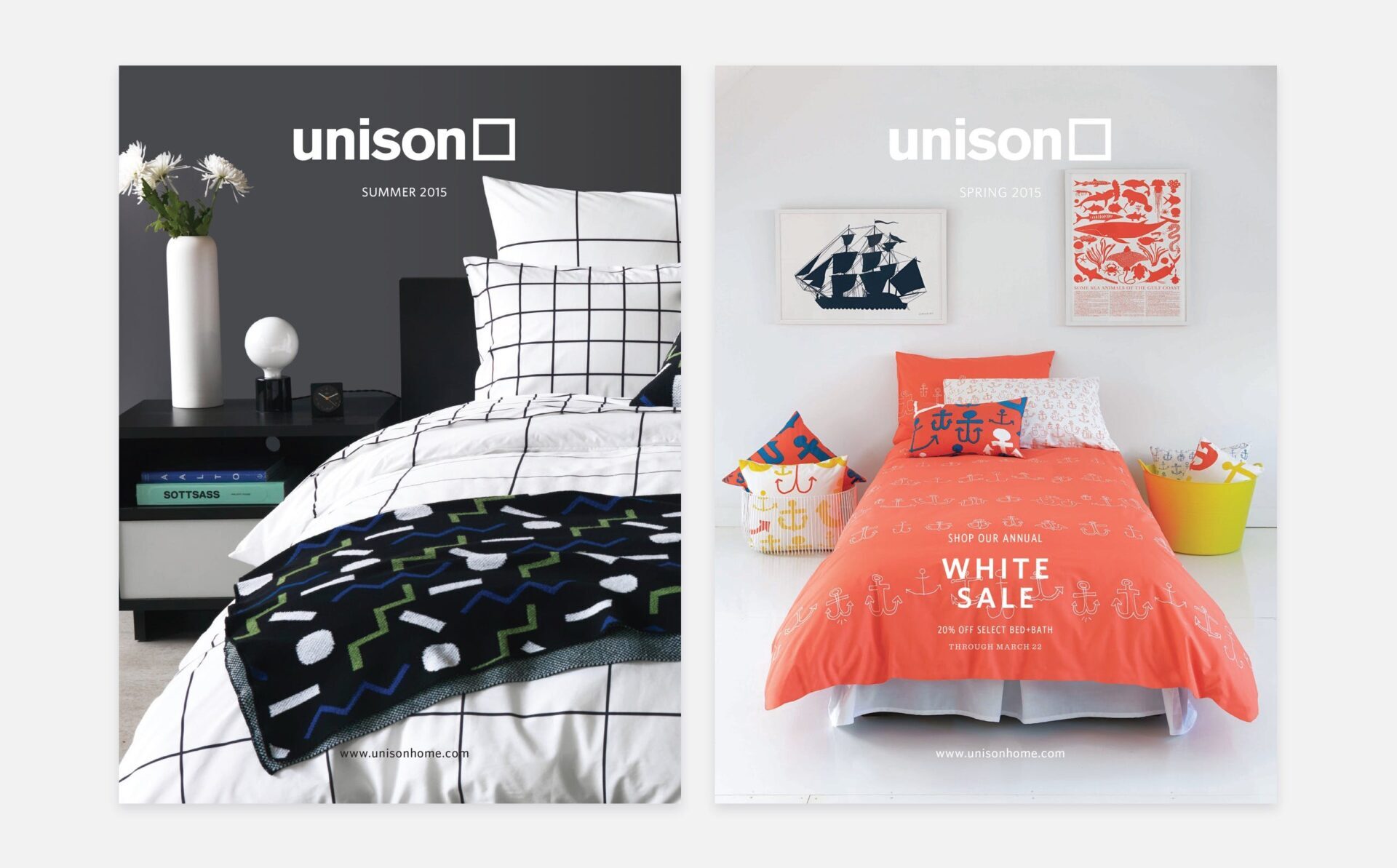 The primary sales vehicle for Unison is their quarterly printed catalog. We collaborated closely to conceptualize and design each issue — everything from selecting the products, to creating shot lists and directing photo shoots, to iterating through layout options. The catalogs continue to make a strong design statement in the home textiles space and drive sales for the company.